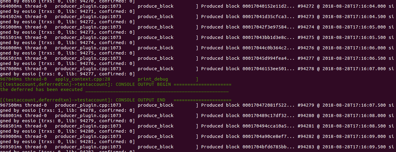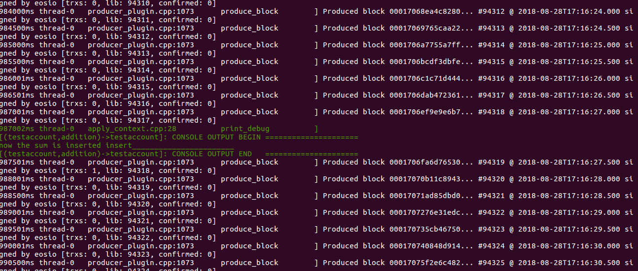 As we give the delay of 20 seconds in the transfertxn action, So after 20 seconds we added the two numbers and put them into the table. So after 20 seconds, your addition action will trigger and our nodeos window looks like this if works as intended.